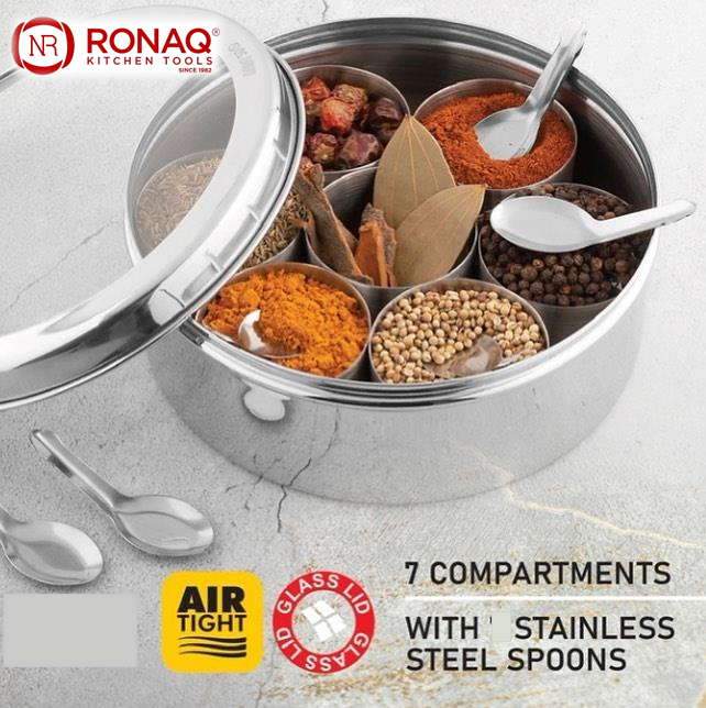 Stainless Steel Round Indian Spice Box Masala Dabba PRODUCT DESCRIPTION Non Breakable Transparent Empty Spice Box with 7 Container and 2 small spoons. Seven individual compartments to store all your authentic spice separately Transparent lid for easy viewing of spices Spice Box Spices not included. Material – High Quality Stainless Steel and Transparent